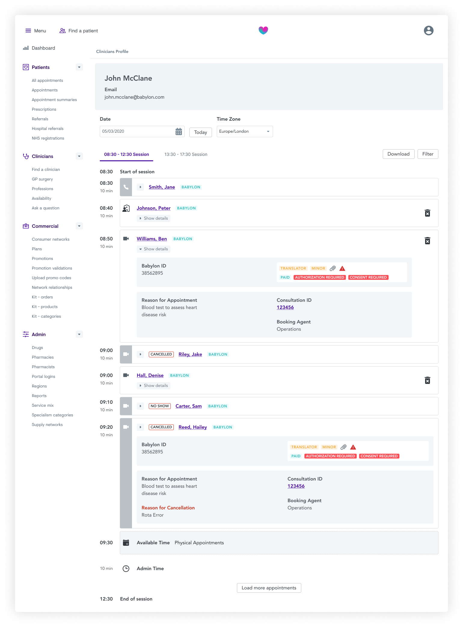A daily overview of a Clinicians schedule. This brought together information and functionality which was previously across 5 different pages. Now with the new page Clinical Liaisons and Operations can not only view what appointments a Clinician has but also details such as available slots, statuses of appointments and being able to cancel appointments.